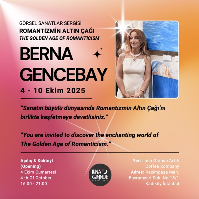Berna Gencebay’ın “ROMANTİZMİN ALTIN ÇAĞI | THE GOLDEN AGE OF ROMANTICISM” isimli sergisi; yağlı boya, akrilik, rölyef ve farklı dokuların kullanıldığı özgün eserlerden oluşuyor. Yeşilçam’ın unutulmaz yıldızlarına ve İstanbul’un zamansız güzelliğine sanat aracılığıyla saygı duruşunda bulunuyor. 1960’lı yılların masumiyet ve zarafetini günümüz estetiğiyle buluşturuyor. Sanatseverleri aşkın, duygunun ve estetiğin altın çağına yolculuğa davet ediyor.
